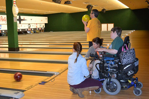Bowling offers rewarding challenges while improving hand-eye coordination, balance, strength and concentration. The bowling program is for people with disabilities that are interested in meeting new people while developing adaptive bowling skills. Adaptive equipment is available to ensure that everyone can experience the fun of bowling.