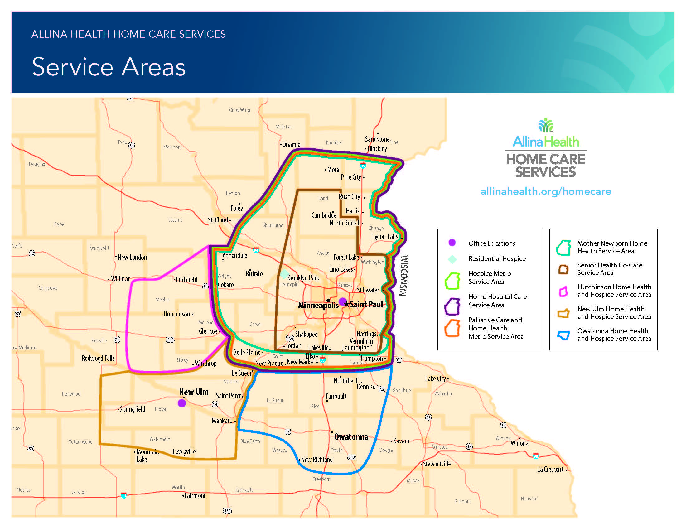 Hospice care from Allina Health is available to anyone living in our service area including Minneapolis, St. Paul, the Twin Cities area, Hutchinson, New Ulm, and Owatonna.